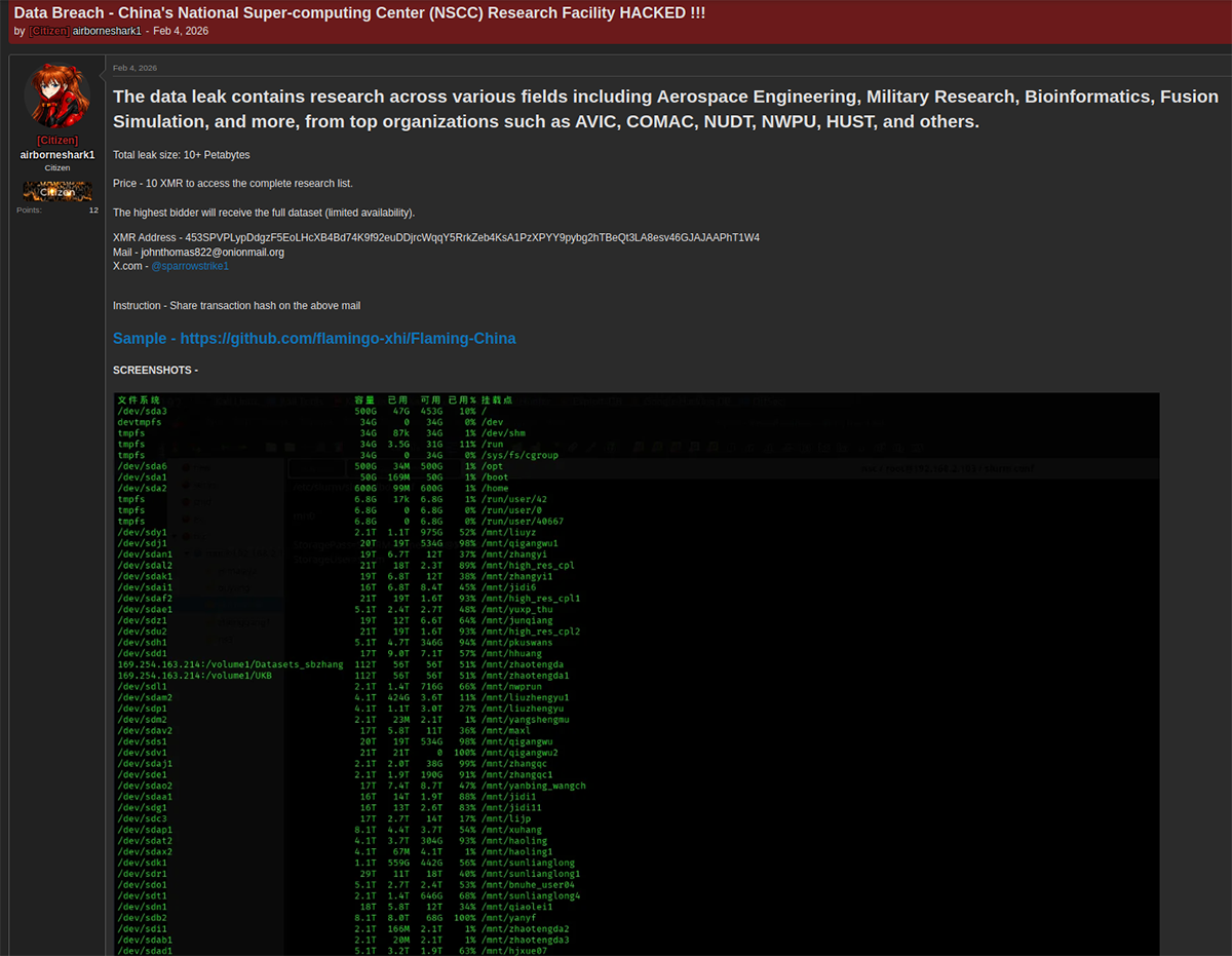 Breach of Chinese National Supercomputing Center (NSCC)