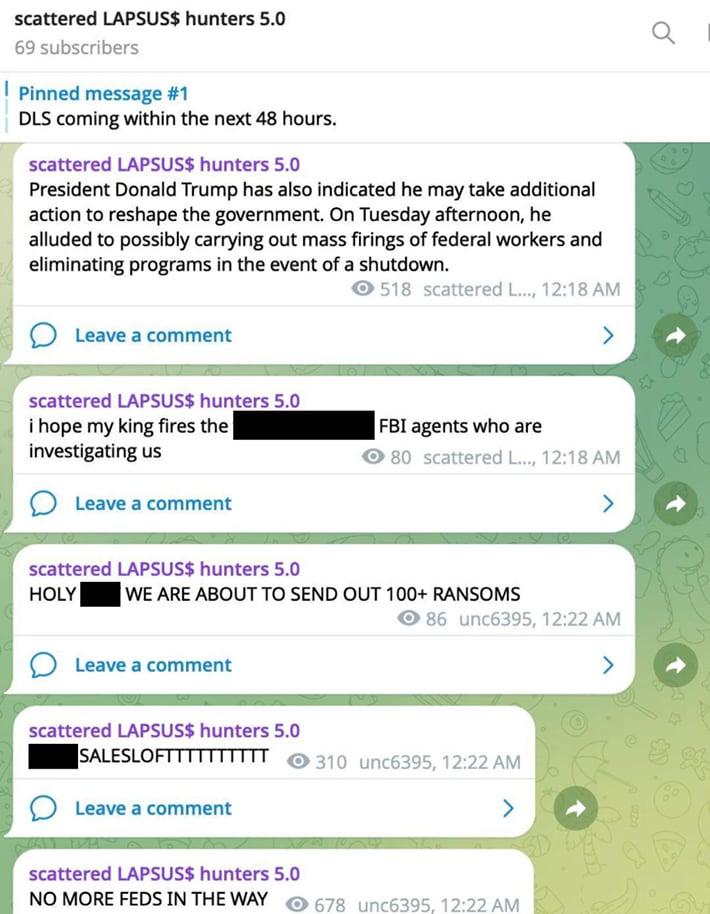 Posts from scattered LAPSUS$ hunters 5.0 on Telegram. Original image shared by journalist Andy Greenberg via LinkedIn.