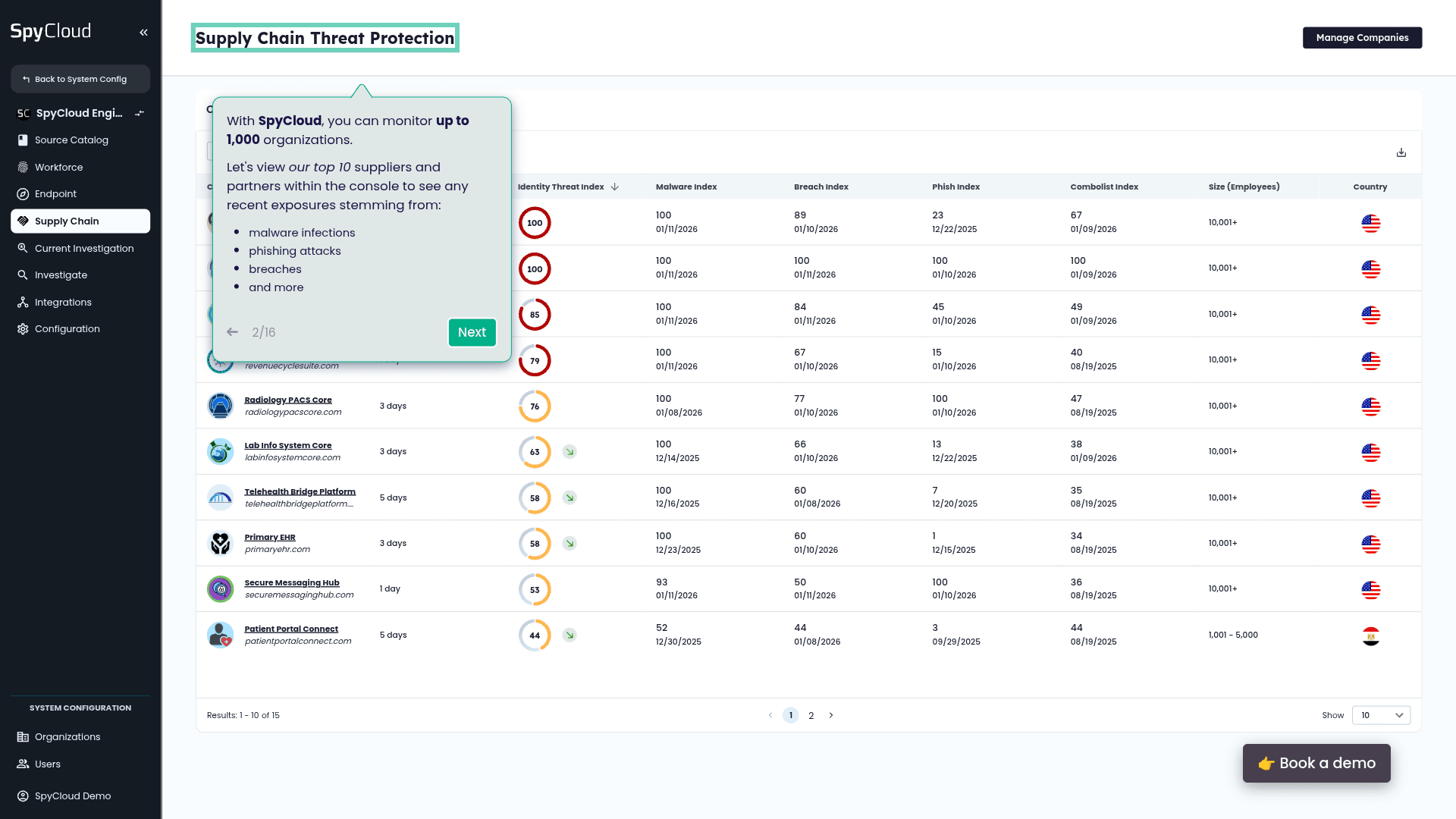 SpyCloud Supply Chain Threat Protection closes this gap by monitoring for vendor credentials and authentication data exposed in breaches, malware infections, and phishing attacks.