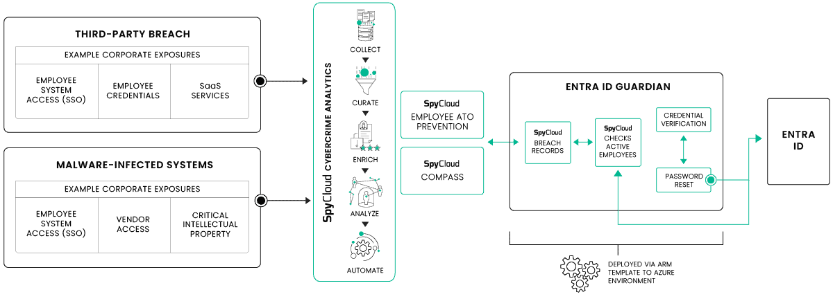 SpyCloud Entra ID Guardian protects your workforce identities by continuously checking Microsoft Entra ID credentials against billions of recaptured darknet assets. When SpyCloud detects exposed usernames and passwords tied to your Entra users, it enables automated, policy-driven remediation – helping you stop account takeover. With daily exposure updates and flexible remediation actions, Entra ID Guardian plays a critical role in enforcing Zero Trust identity principles and reducing organizational risk.